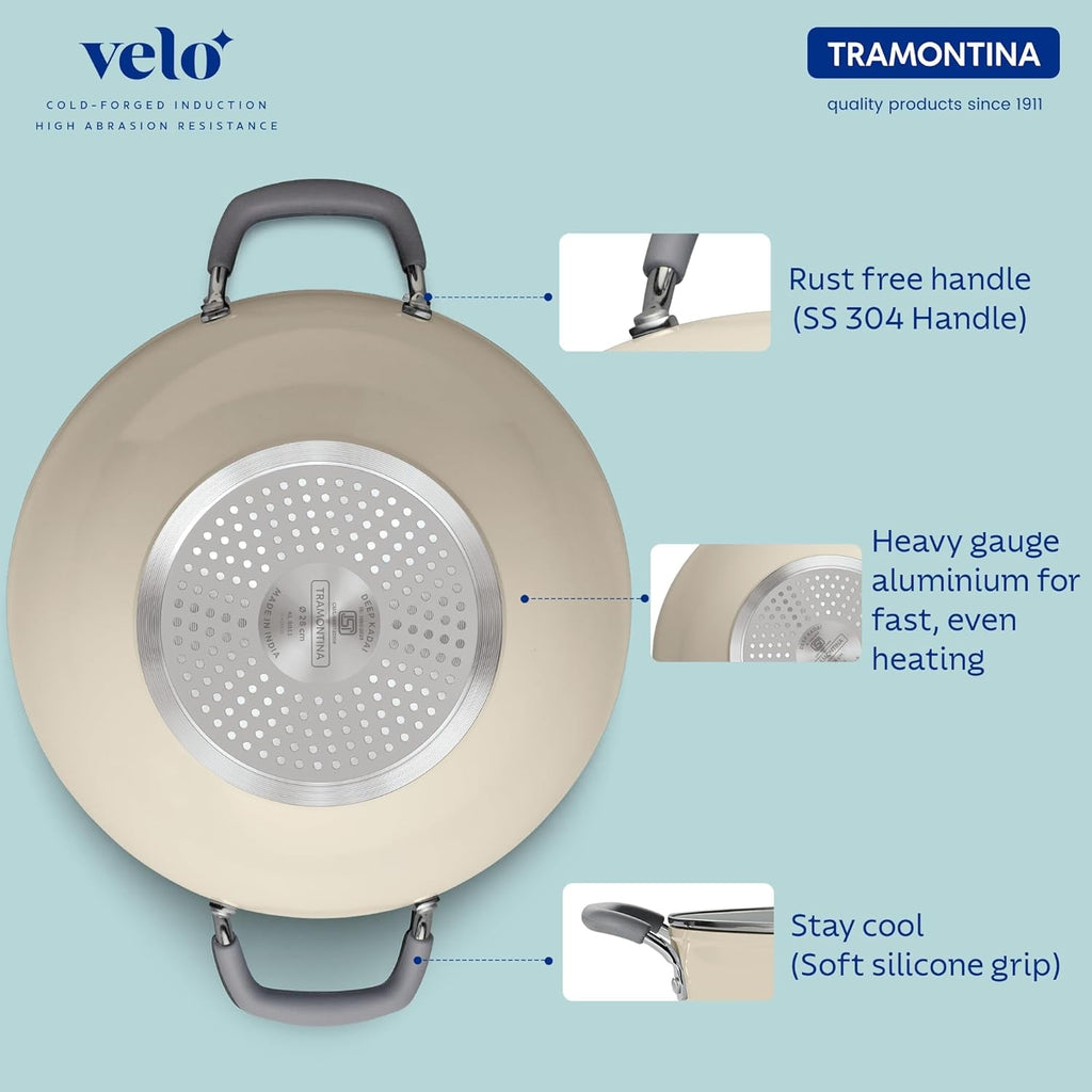 PREMIUM CERAMIC REINFORCED COATING: This Tramontina VELO kadhai features a premium ceramic-reinforced coating for smoother food release and healthier low-oil cooking. Designed for durability, it is abrasion-resistant.